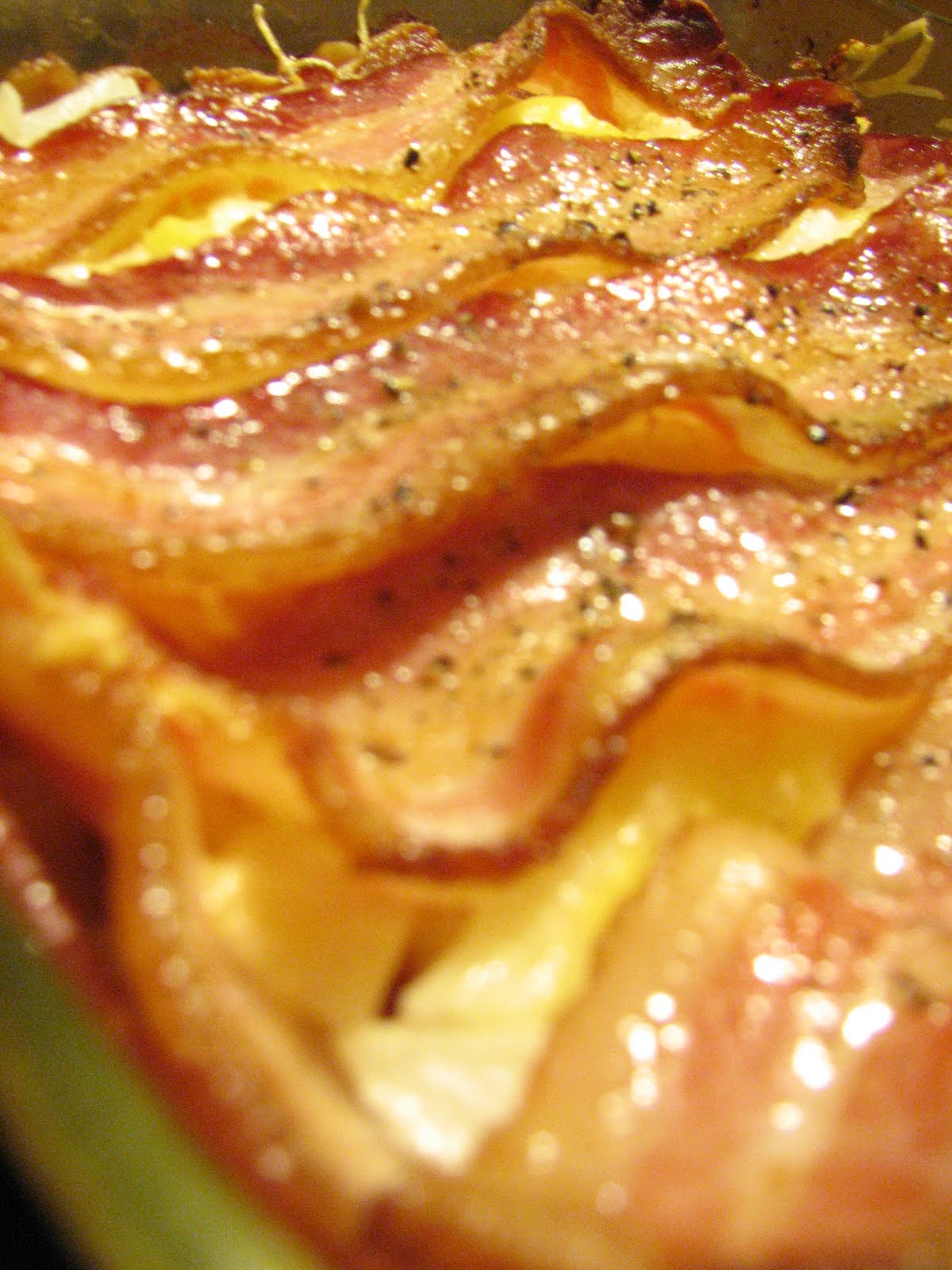 So simple, so brilliant. There are three ingredients: bacon, cheese and onion. They are put in layers and baked. I highly recommend it.